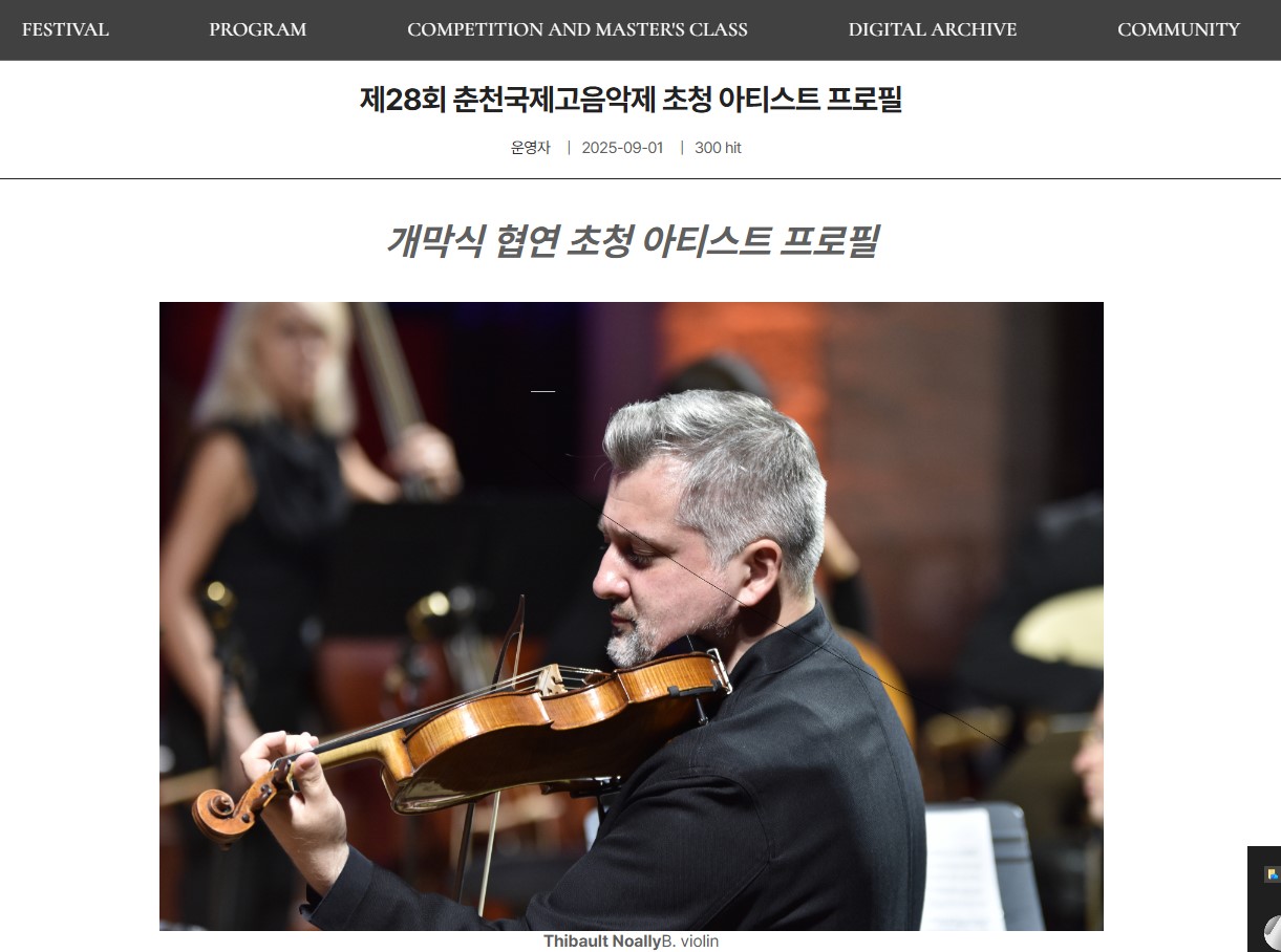안녕하세요 홈페이지를 둘러보다 보다가 '제28회 춘천국제고음악제 초청 아티스트 프로필'에 바이올리니스트 티보 노알리씨의 프로필 사진에 줄이 그어져 있는 것을 발견하여 알려드립니다. 가능하다면 원본의 사진으로 교체 해주시면 고맙겠습니다.